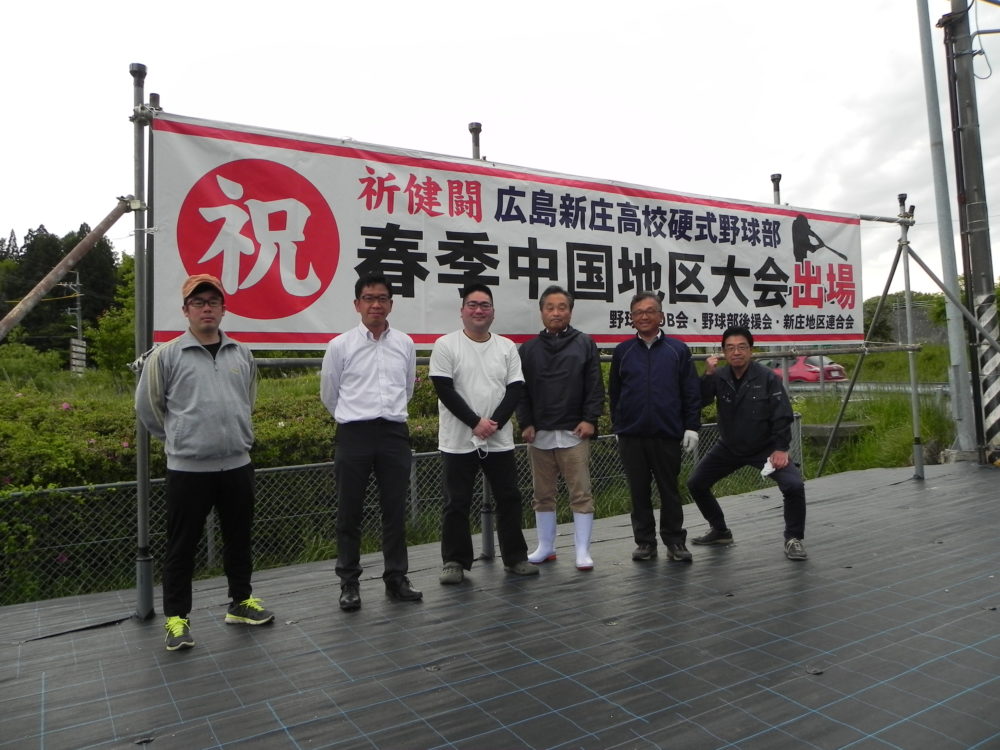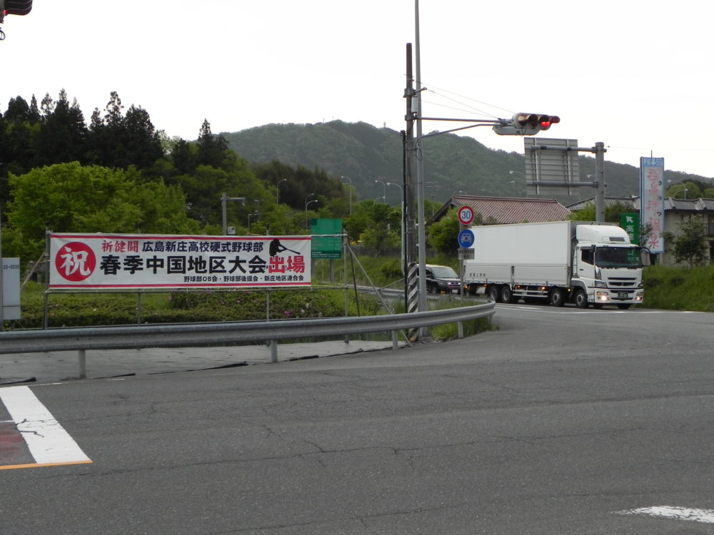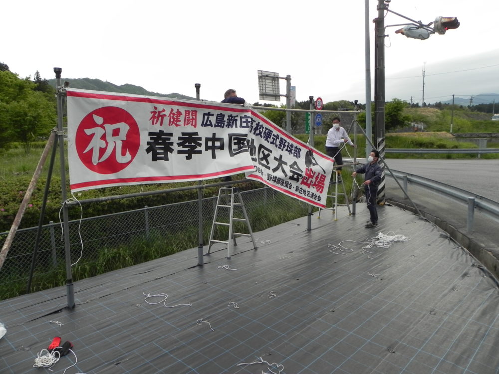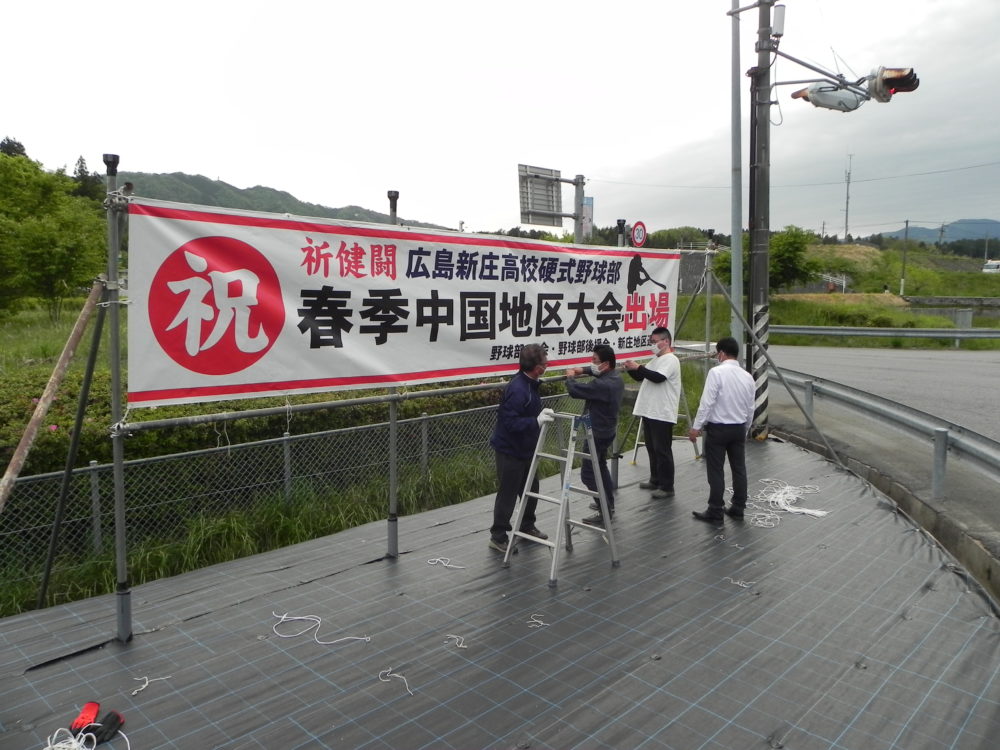 春季県高校野球大会決勝戦で呉港高校に7対2で快勝、3年ぶり3度目の優勝を飾り6月5日(土)から鳥取県米子市で開催される第136回中国地区高校野球大会に出場することが決まりました。5月10日(月)、OB会のメンバーで大朝IC出入り口付近に大会での健闘を祈り横断幕を掲げました。チームは作夏の新チーム結成以来、練習試合を含め県内無敗をつづけています。